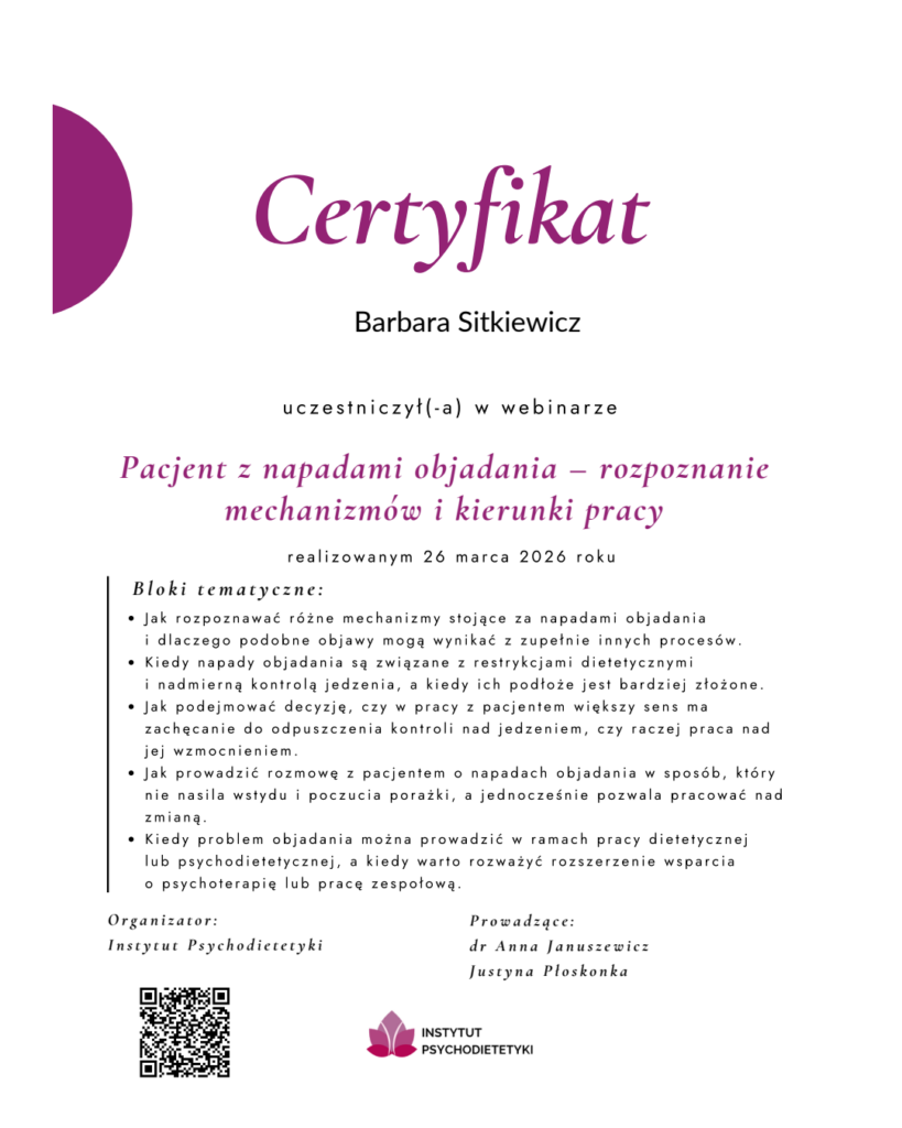 Jestem dietetykiem klinicznym ze specjalizacją w psychodietetyce. Łączę rzetelną wiedzę medyczną z empatią i doświadczeniem, aby skutecznie wspierać w zmianie nawyków i leczeniu chorób. Pracuję głównie w obszarze zaburzeń odżywiania, ginekologii, endokrynologii i niepłodności, ale pomagam też dzieciom, osobom z niedoczynnością tarczycy, otyłością czy wybiórczością pokarmową.